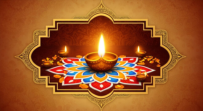 Diwali Concept design. Traditional background with diya lamp, golden frame and rangoli pattern