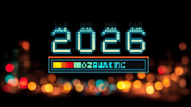 A futuristic "2026 loading" text with a glowing progress bar, set against a dark background, featuring retro video game elements and pixel art, with blurred bokeh lighting in the foreground.