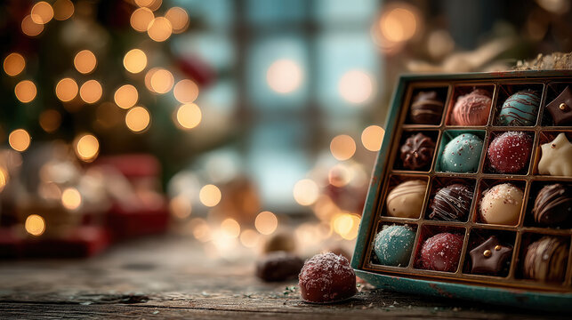 close-up of advent calendar with opened window revealing chocolate blurred christmas tree lights festive holiday countdown cozy winter tradition seasonal decoration home interior