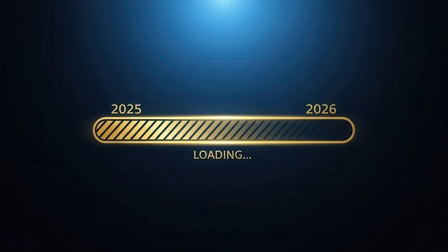 Golden loading bar with "2025" and "2026" and "LOADING..." text on a dark blue background.