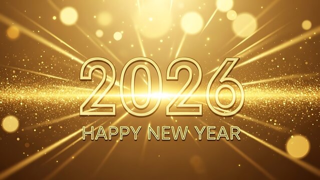 Striking golden graphic design prominently featuring the numerical year 2026 and the celebratory phrase happy new year set against a background of sparkling light rays and bokeh effects for festive oc