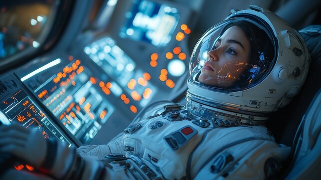 An astronaut sits focused in a spacecraft, surrounded by control panels illuminated by numerous screens and buttons, ready for an upcoming mission into space.