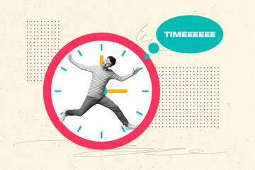 Creative collage young man time management arrangement clock countdown schedule limit bubble think hour minute regime drawing background
