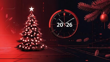 A digital Christmas scene with a twinkling tree, futuristic clock counting down to the year 2026, and a festive atmosphere