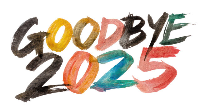 Text goodbye 2025 painted in colorful watercolor strokes isolated on transparent background