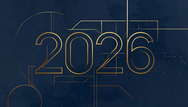 Gold 2026 numerals with geometric lines and star glow on dark blue background for futuristic New Year design.