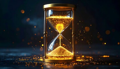 Golden hourglass with sand flowing on black background