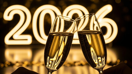 New Year countdown clock striking midnight with glowing hands, large golden “2026” overlay, dramatic shadows, fireworks bursting in the distance, cinematic festive mood, 8K