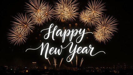 Elegant white cursive Happy New Year script overlaying a vibrant golden firework display above a dark city skyline.