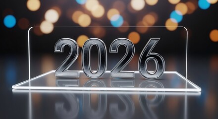 Silver 3D number 2026 on a glass panel with glowing edges, reflecting on a dark sleek surface. Modern design for forecasting current year and future events. New Year concept.