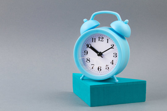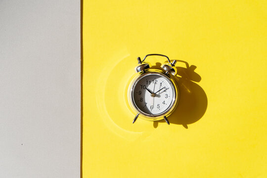 Alarm clock on pink and grey background with deep shadows. Waking up, morning concept. Minimalism. Top view, flat lay