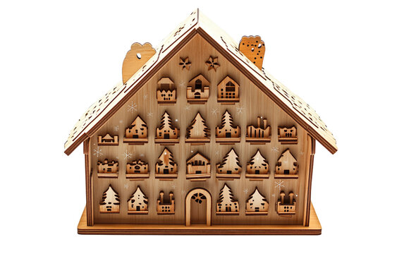 Festive Christmas wooden advent calendar shaped like a house countdown holiday collectible decorative ornament isolated on white background