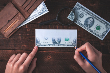 Counterfeiter forges banknotes. Fake concept. Fake money, a wallet with American dollars, a magnifier on a wooden background. Top view