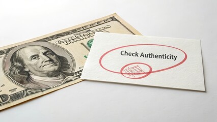 Woman holding dollar bill and looking at it with watermarks closeup.