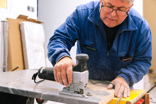 Mature handyman cutting countertop with jigsaw
