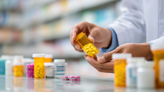Pharmacist's hands counting pills into a prescription bottle, with blurred shelves of medications in the background