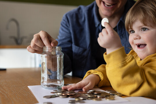 Father and Child Sorting Coins at Home Table