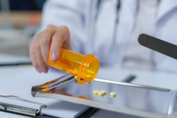 Pharmacist wearing white coat and stethoscope is pouring pills from an orange plastic bottle onto a metal pill counting tray while holding a spatula in the other hand