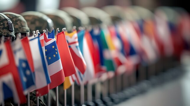 Close-up of NATO country flags placed side by side, with soft-focus military helmets in the background, illustrating the concept of defense and strategic partnerships.