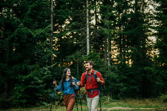Young couple enjoying a forest hike with backpacks in outdoor adventure