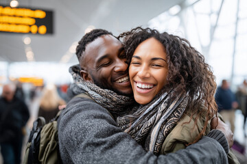 Smiling couple hugging after arrival in busy airport terminal, bright natural light,