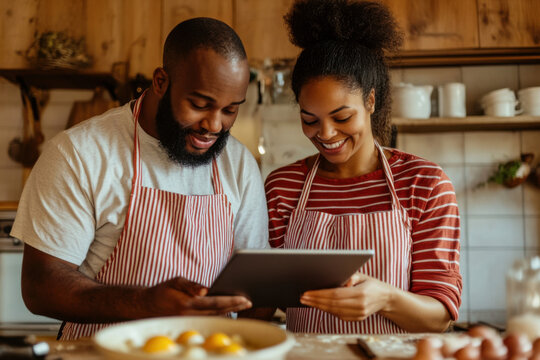 Young couple in a cozy kitchen using a tablet to follow a recipe together, wearing matching aprons and surrounded by cooking ingredients and a comfortable atmosphere