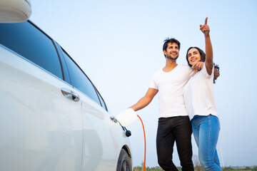 Lovely young caucasian couple charging their electric vehicle or EV car at fast charging EV station.