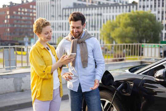 A couple looks at a smartphone while their electric vehicle charges at a charging station.