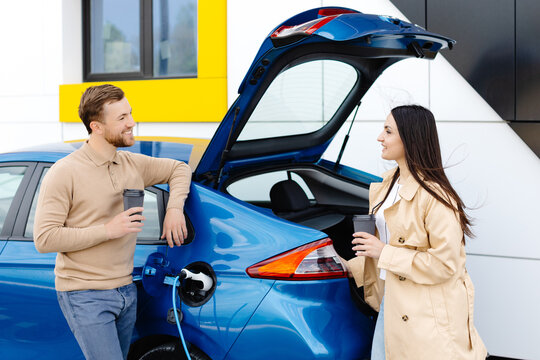 Smiling Couple Charging Electric Car While Using Smartphone. Man And Woman Standing By EV, Enjoying Coffee Break. Modern Technology, Sustainable Transportation, Eco-Friendly Lifestyle.