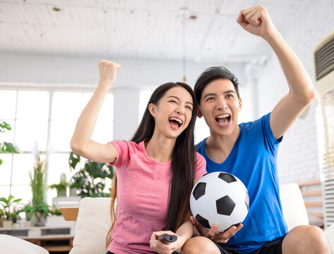 Young couple watching tv and  raising hands to celebrating the victory