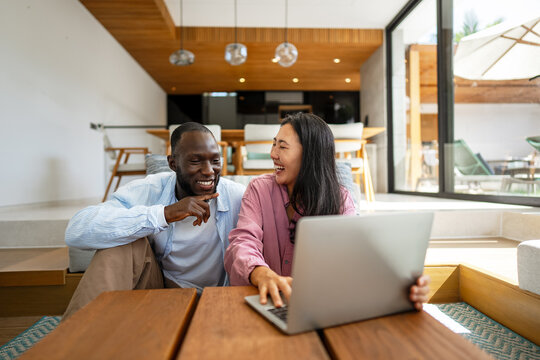 Diverse couple collaborating on laptop in bright home