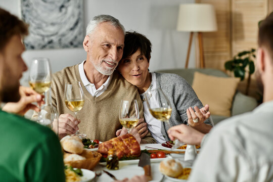 Elderly diverse couple celebrating with champagne in warm garden setting