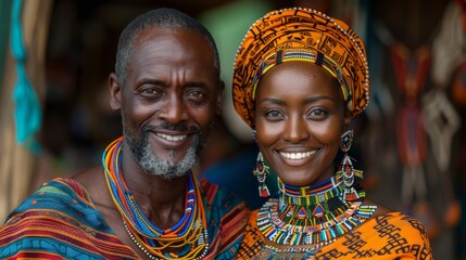 Mature African couple in colorful traditional clothing, exuding warmth and togetherness