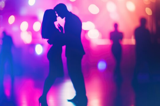 A couple's silhouette embraces intimately amidst vibrant, blurred club lights. This romantic scene suggests a deep connection during an evening celebration or dance.