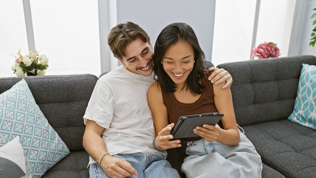 Happy interracial couple sharing a moment with tablet on cozy sofa indoors, expressing affection and leisure in their stylish apartment.