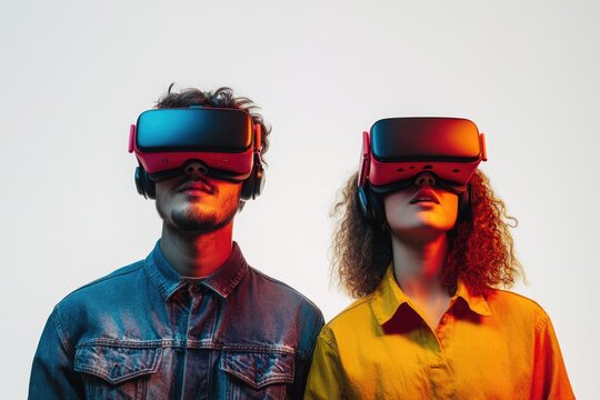 A young couple wearing VR headsets, experiencing immersive virtual reality together.