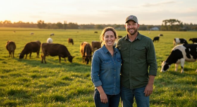 Cow, countryside or couple on agriculture farm harvesting healthy organic livestock for growth sustainability. Back view, partnership or woman farming cows or cattle with farmer on natural grass land