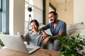 Happy influencers couple having fun with wood vintage sledding on snow high mountains - Young crazy people enoying winter vacation - Travel and holiday concept