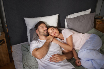 A couple lies in bed, embracing each other gently. Their expressions reveal comfort and love as they enjoy a tranquil moment together in a softly lit bedroom, surrounded by pillows.