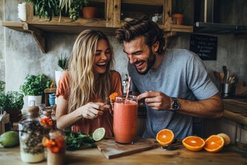 A couple laughing together as they prepare a smoothie in a cozy kitchen, enjoying the process of making a refreshing drink at home