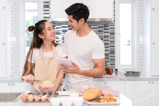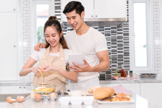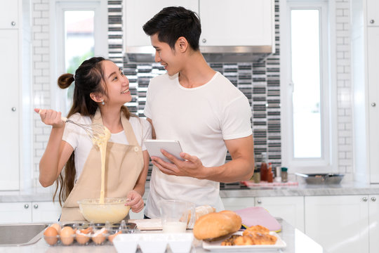 Couple cooking bakery in kitchen room, Young asian man and woman together making cake and bread with egg, looking menu from tablet in the flour happy relaxing in at home