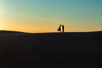 A couple's silhouette is captured as they dance against the backdrop of an orange sky during sunset on a hill