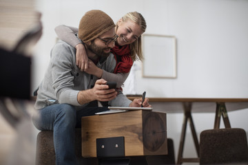 Portrait of success business people working together in home office. Couple teamwork startup concept