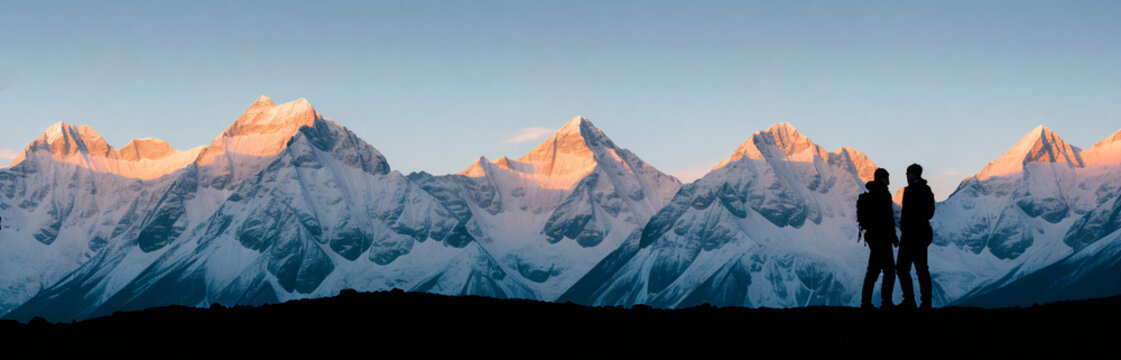 Silhouette of two person on top of mountain peak. / Holding Hands / coaching goal, success and teamwork concepts - Mountains Mountaineer / Space for Text / Blank Space / Copy Text