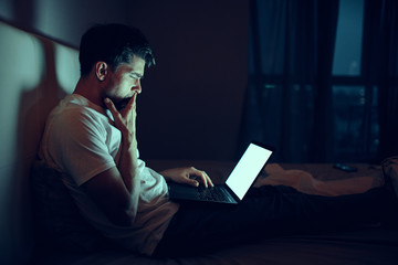 Handsome guy and his girlfriend using modern gadgets while sitting on couch at home.