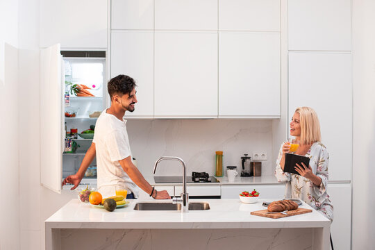 Happy young couple using digital tablet at home kitchen table, activating smart home virtual assistant, application, service, typing on gadget, enjoying modern wireless Internet domestic technology