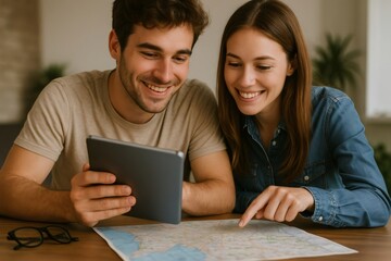 Couple preparing for honeymoon, using tablet and packing suitcase