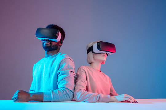 joyous beautiful multiracial couple in homewear sitting on sofa with virtual reality headsets