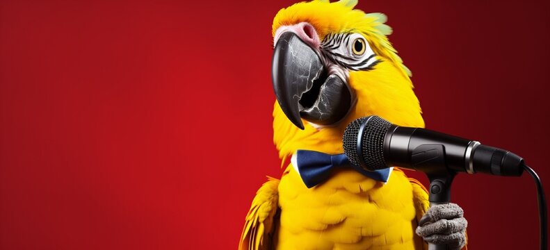 Witty parrot wearing a bow tie and holding a microphone, ready to tell jokes on yellow.