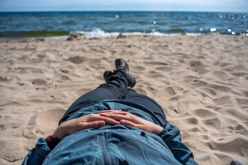 Stenshuvud National Park Relaxing Caucasian  Outdoor Woman laying down or Contemplation  on the Long sunny Sandy Beach in Osterlen Skane, South Sweden.